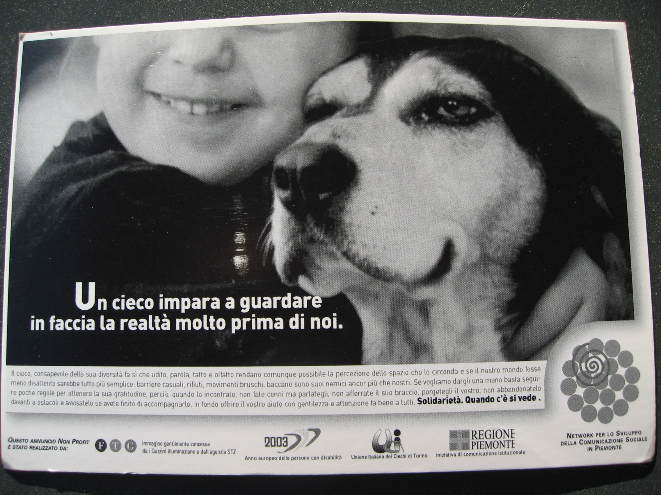 Appena l’ho vista mi si è sciolto il cuore. Prima di tutto per quel muso di cane con gli occhi impregnati di affetto incondizionato e gratuito, poi per il significato di questa immagine che diffonde una nota di solidarietà e amore per le persone cieche, quindi ampiamente condivisibile per il nostro animo e il nostro pensiero.
