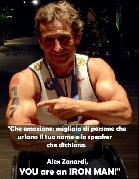 E poi ho goduto un grande momento di languida commozione ascoltando l’intervista radiofonica di Alex Zanardi che raccontava l’arrivo dopo aver terminato una durissima gara di triathlon. Narrando, lui stesso commosso, la meravigliosa emozione nel sentire (mentre spingeva verso il traguardo la sua carrozzina da paraplegico) lo speaker urlare sulla folla esultante: “Alex: YOU are an ironman”.