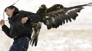 che mi ha indotta a modificare il mio pensiero primario, ossia: il rapace non ha attaccato il fotografo beccato casualmente a sbirciare nel privato della steppa, ma sembra essersi ribellato all’uomo che lo tiene legato; infatti il pezzo di corda che lui ha in mano potrebbe essere questa