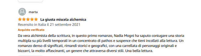 Ringrazio Marta, lettrice sconosciuta, che ci ha dato fiducia acquistando il libro e scrivendo la sua recensione.