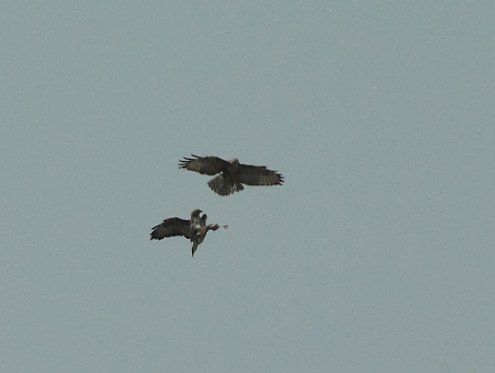 La poiana è un’animale meraviglioso! Lo sono tutti i rapaci, ma lei si fa notare. Dopo il biancone e l’aquila reale, qui da noi è fra i rapaci più grandi. La femmina può arrivare, nelle dimensioni, fino a più di un terzo in più del maschio. IN realtà, se posso dire, non si stanno tenendo per gli artigli; questo è un comportamento solo dell’Aquila di mare Testa Bianca, che è davvero spettacolare da vedere, ma che da noi non vive. La danza dell’Aquila di mare T.B: è da mozzafiato, perché loro sì si tengono per gli artigli e cadono a spirale, verso il suolo, fino all’ultimo attimo utile per fare la virata che evita lo schianto. Queste due poiane, invece, stanno per compiere il rituale di corteggiamento in un altro modo e si stanno facendo un dono; il maschio sta porgendo alla femmina un’arvicola, o un’altra preda, come offerta d’amore. La femmina afferra il dono con i suoi artigli e così si compie parte del volo di corteggiamento. E’ bellissimo starle a guardare; è facile individuarle, perché il maschio quando compie il volo di corteggiamento fa un fischio molto forte, ripetuto e udibile a grandi distanze. Nelle giornate più calde e terse, si possono vedere mentre si alzano in quota per espolorare il territorio, spinte dalle correnti termiche, quelle più calde. Fotografarle così non è per niente facile, quindi complimenti al tuo amico.