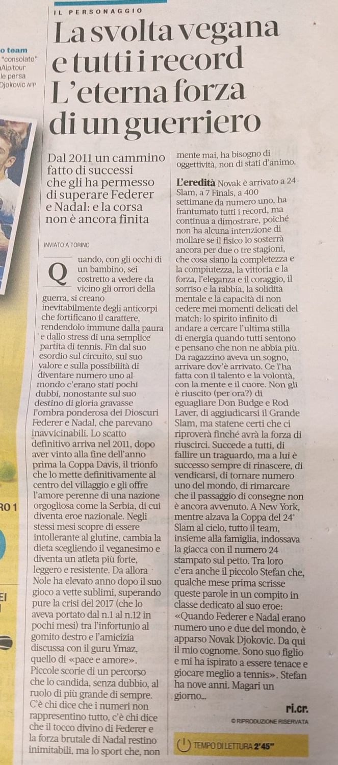 1. Ho tifato Sinner ma ho una smisurata ammirazione per il campione serbo. Sia per la tecnica sopraffina, sia per la tenacia sovrumana. Soprattutto perché quando è stato il momento si è battuto per il bene più grande: la libertà. Ha pagato un prezzo però è rimasto coerente e ha vinto. Un mito assoluto