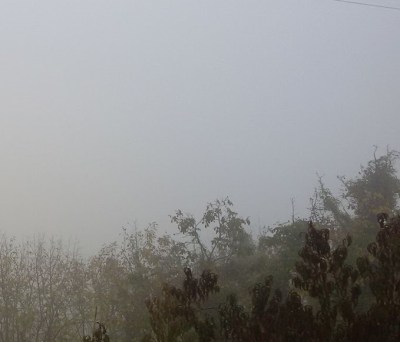 Qui la nebbia si sta un po’ dissolvendo stamane e lascia bagnate tutte le cose.